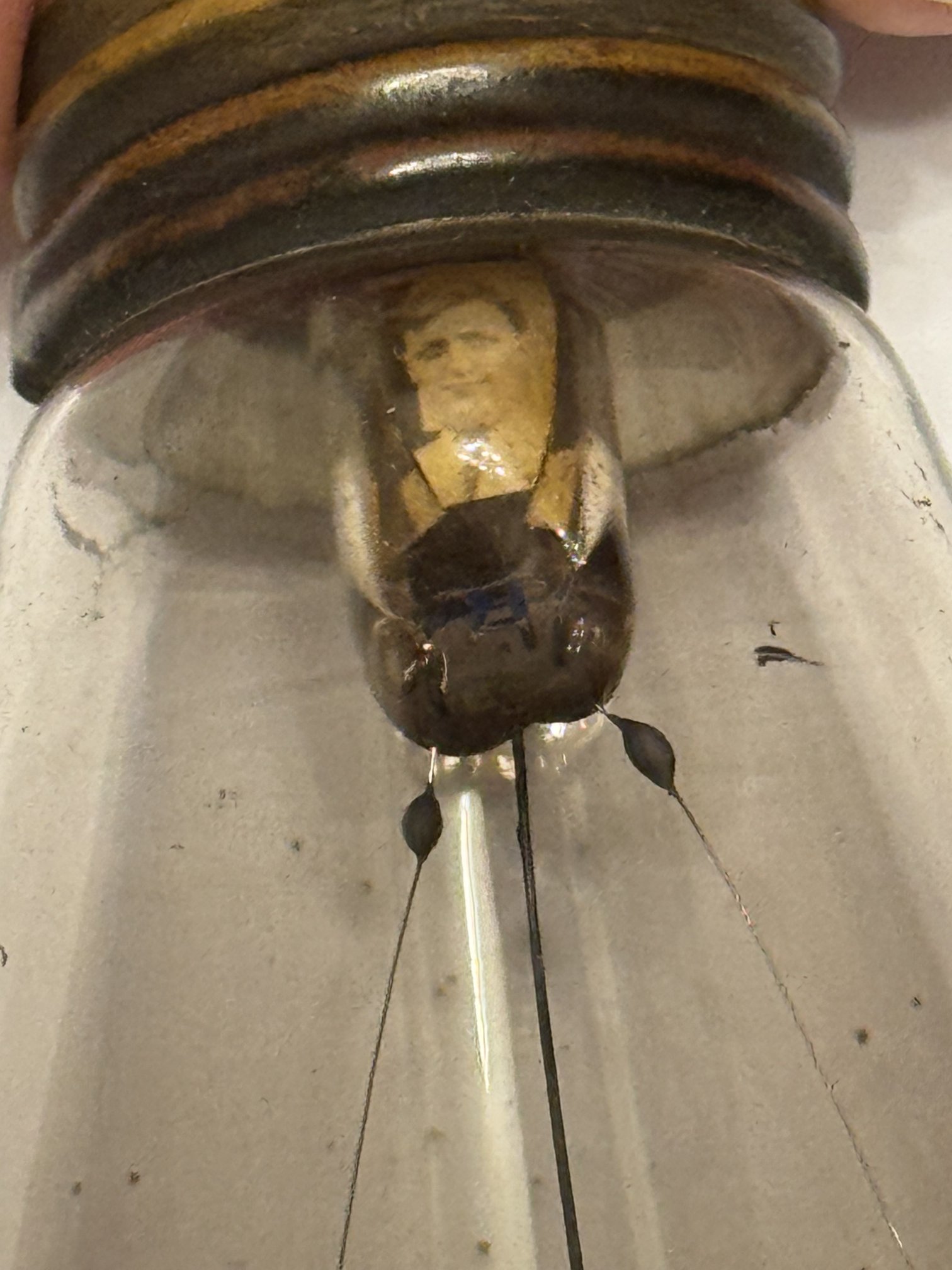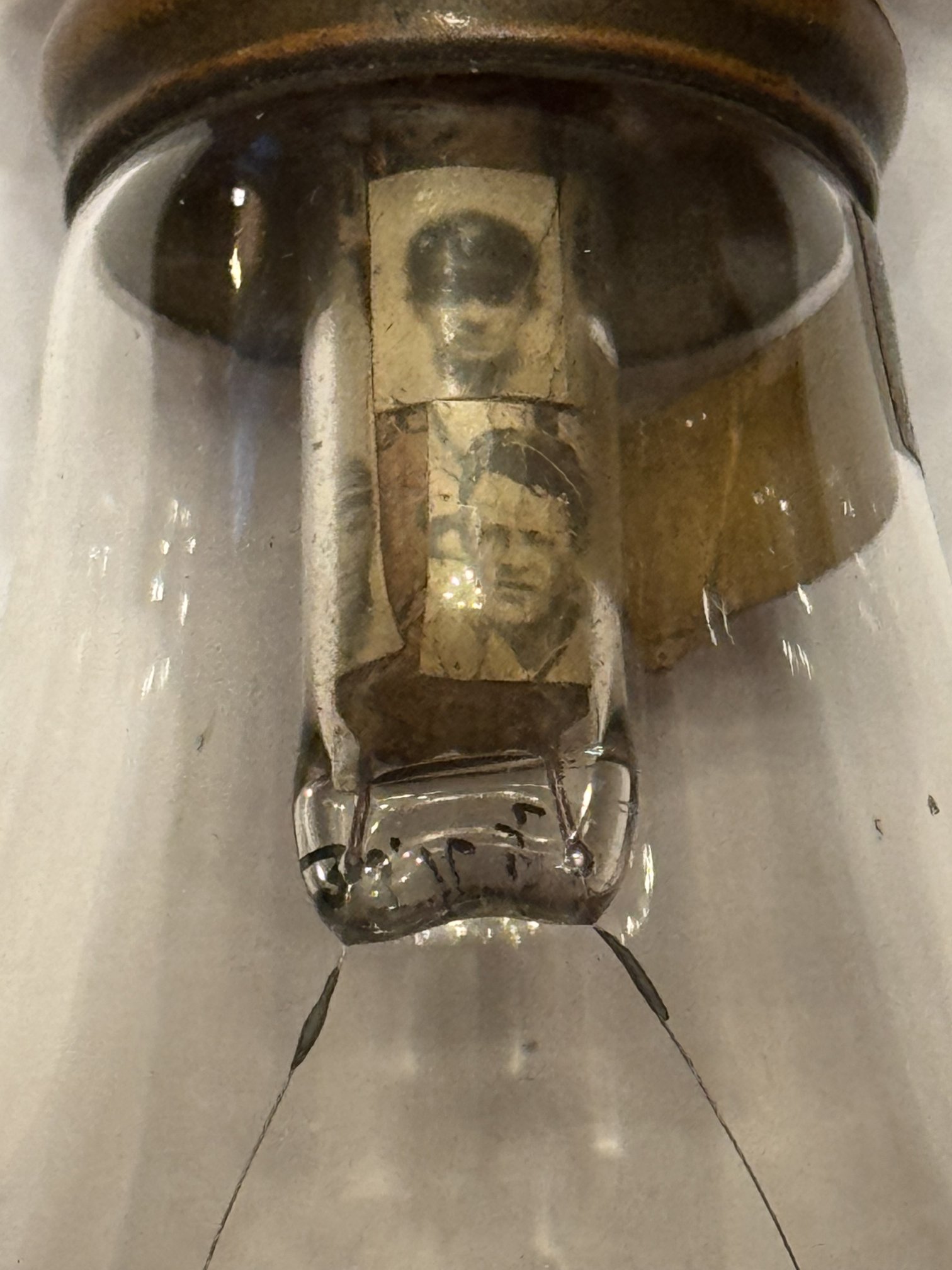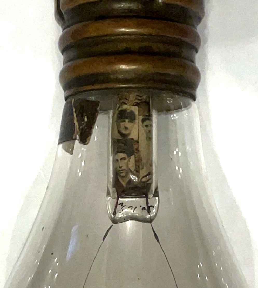 C.1900-1904 3 tipped carbon filament light bulbs with film and newspaper photos of people in their stems, by Candace Freeman of Kansas oct-2025
