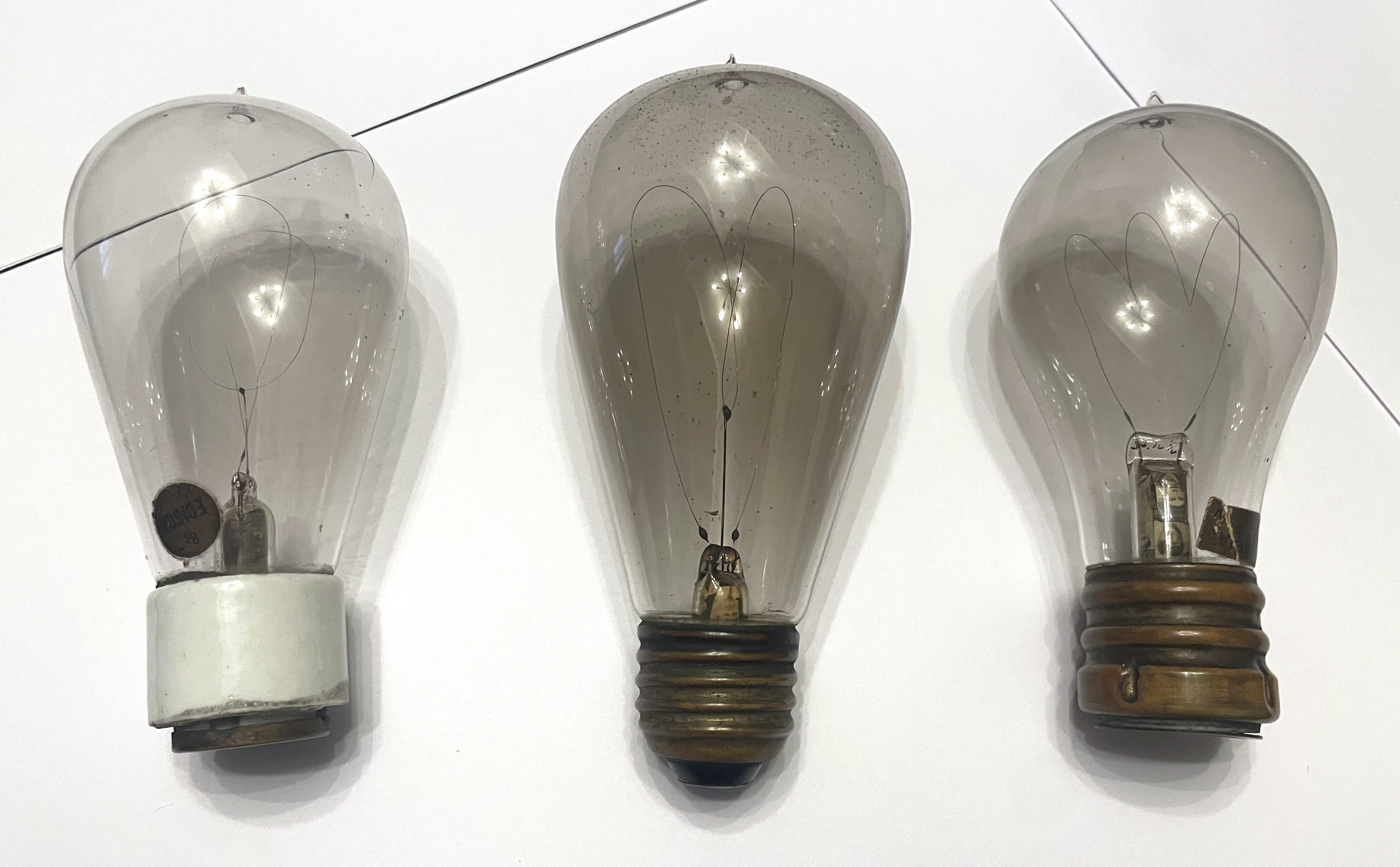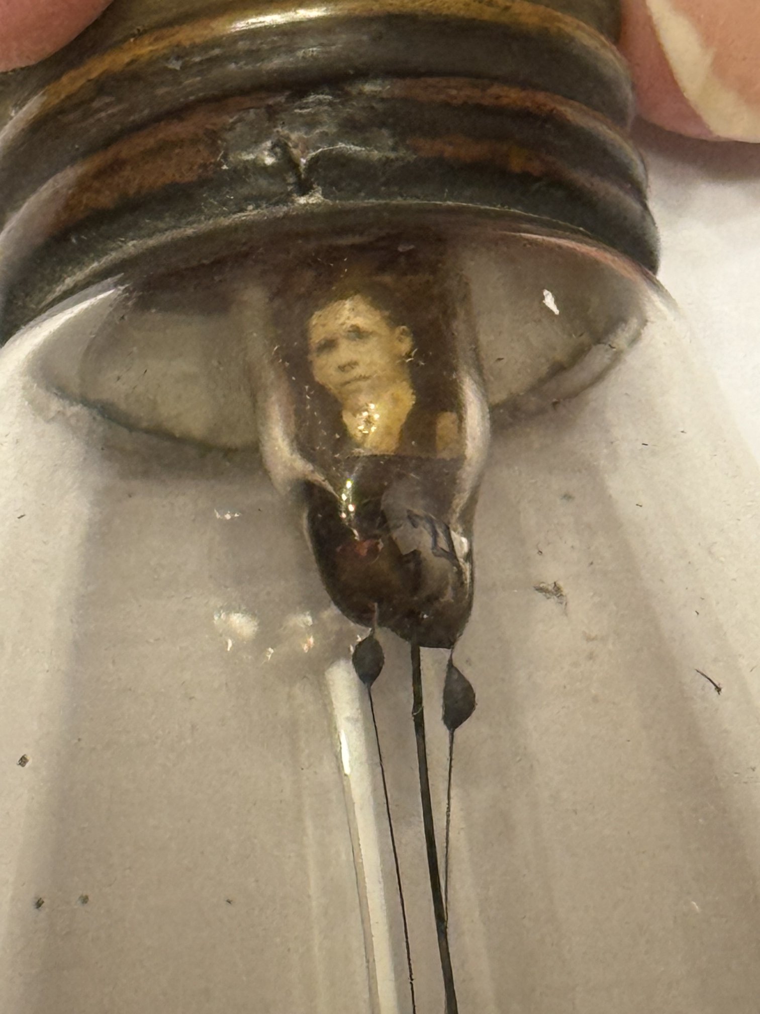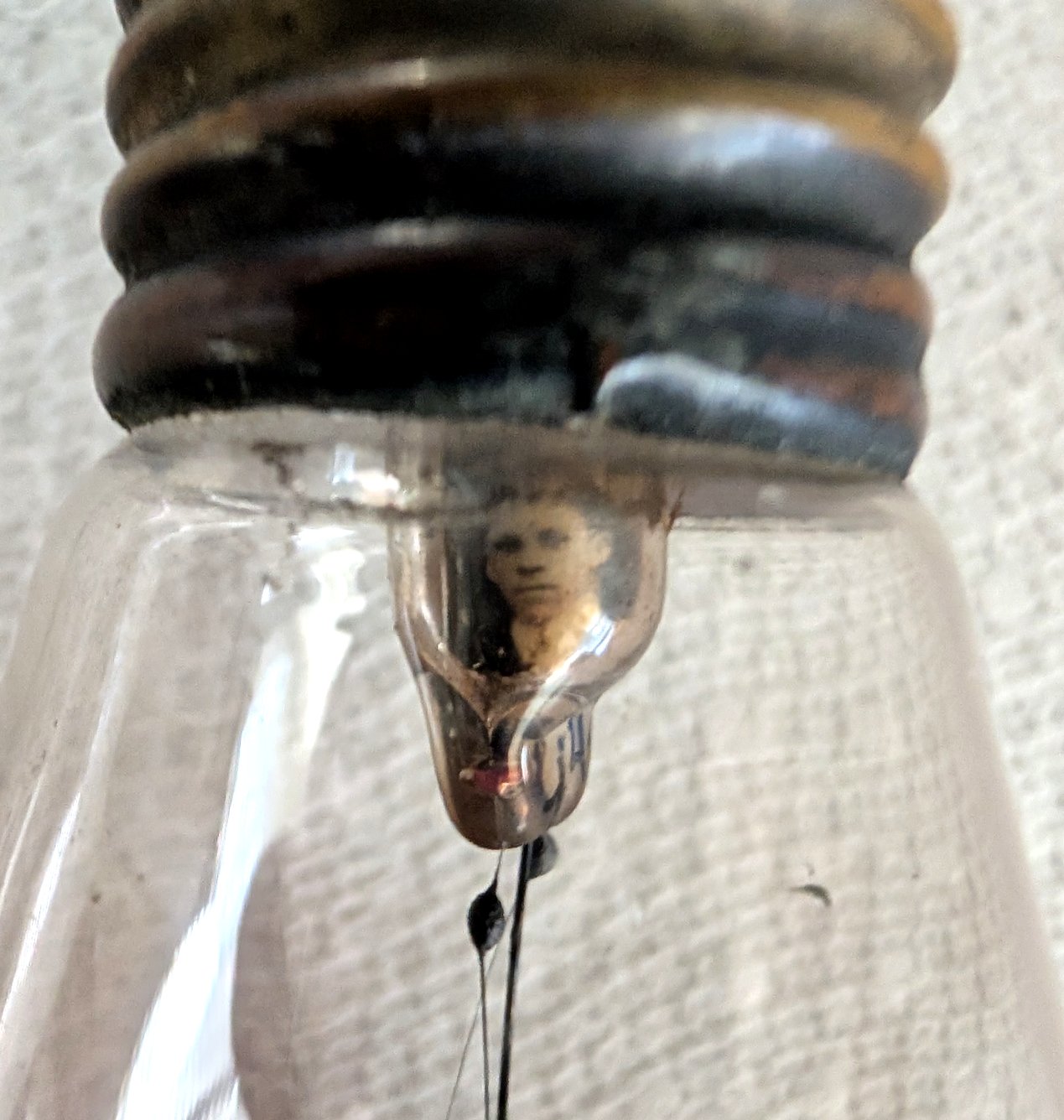 C.1900-1904 3 tipped carbon filament light bulbs with film and newspaper photos of people in their stems, by Candace Freeman of Kansas oct-2025