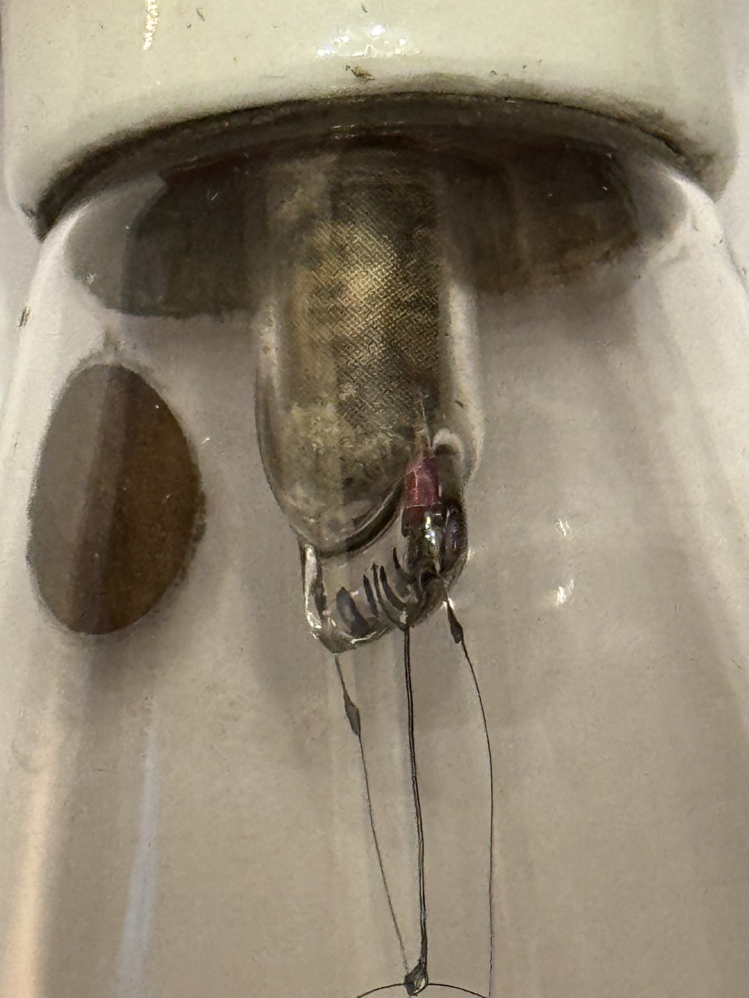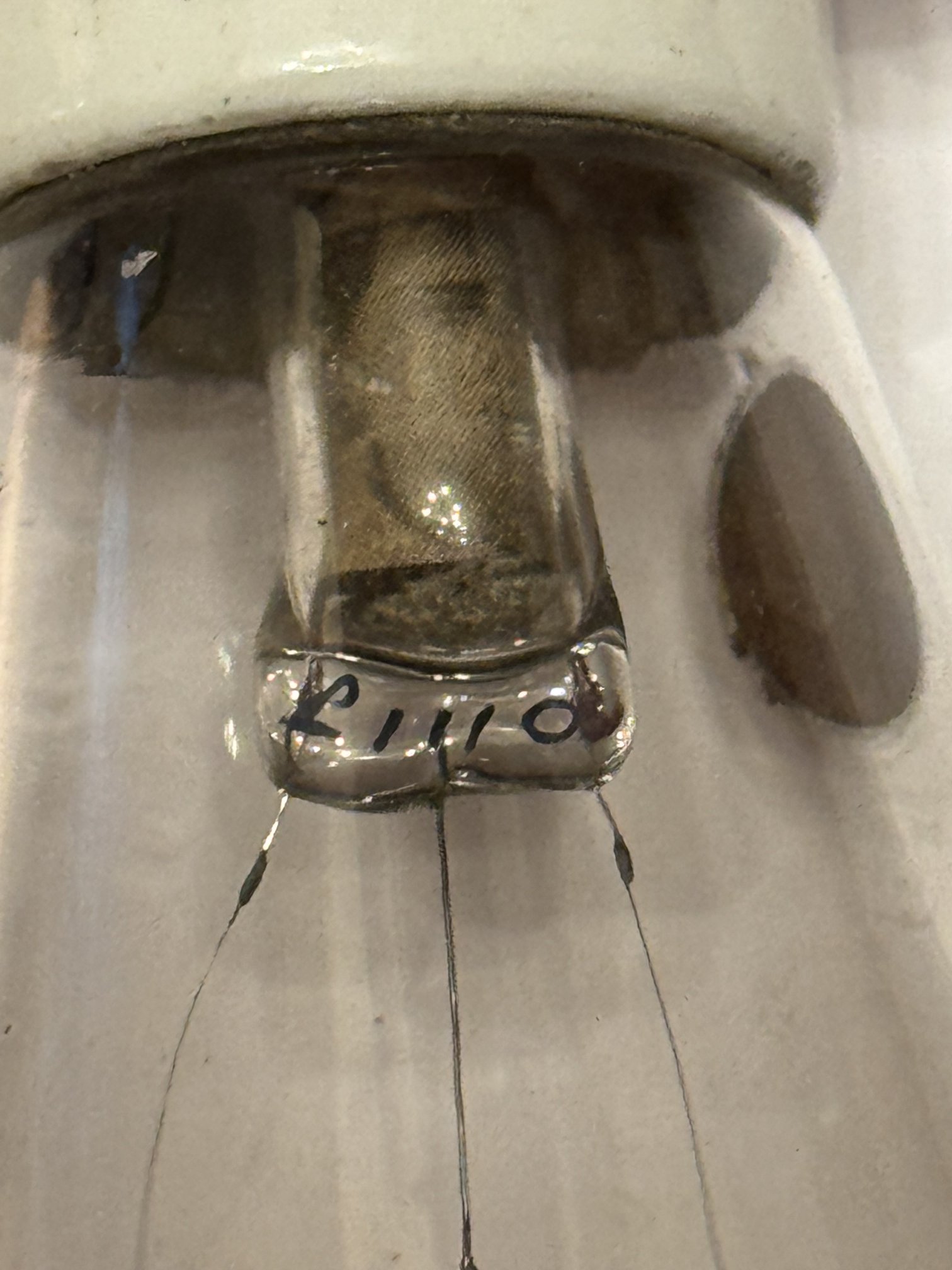 C.1889 hairpin filament light bulb with early Westinghouse Byllesby-Lange base, by anonymous jan-2022